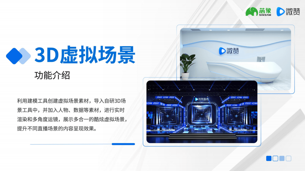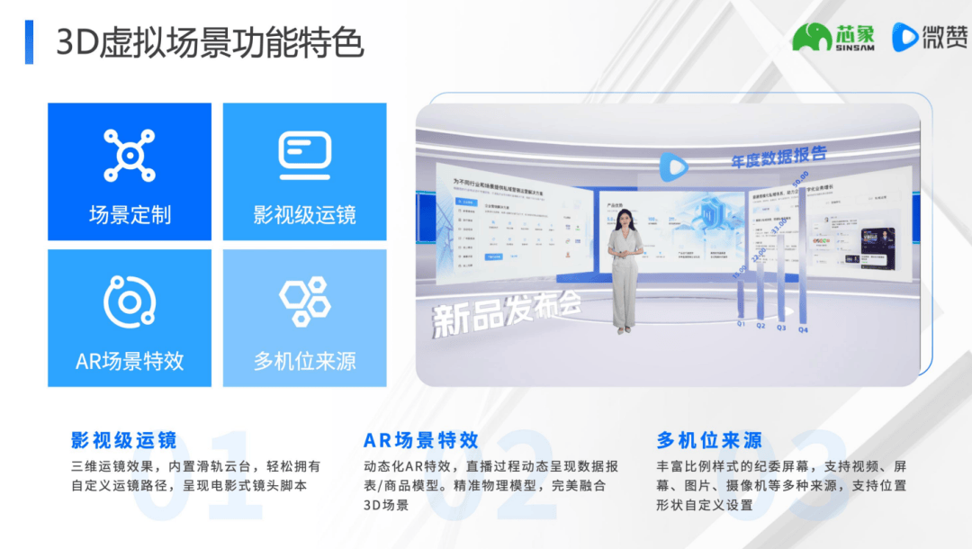 ● 软件功能:自研软件包含可视化 3D 空间编纂器(可自从调整场景结构)、环节词触发智能导播;